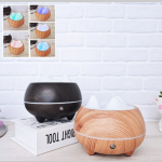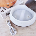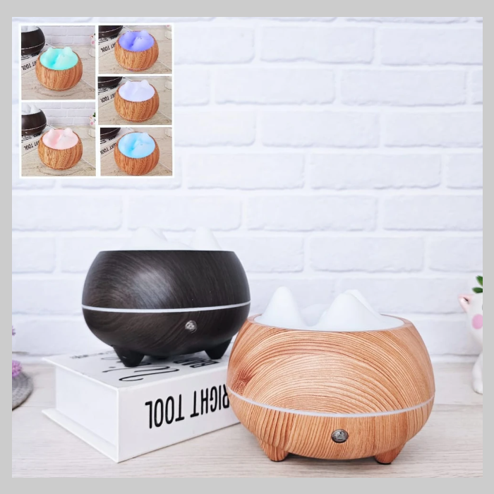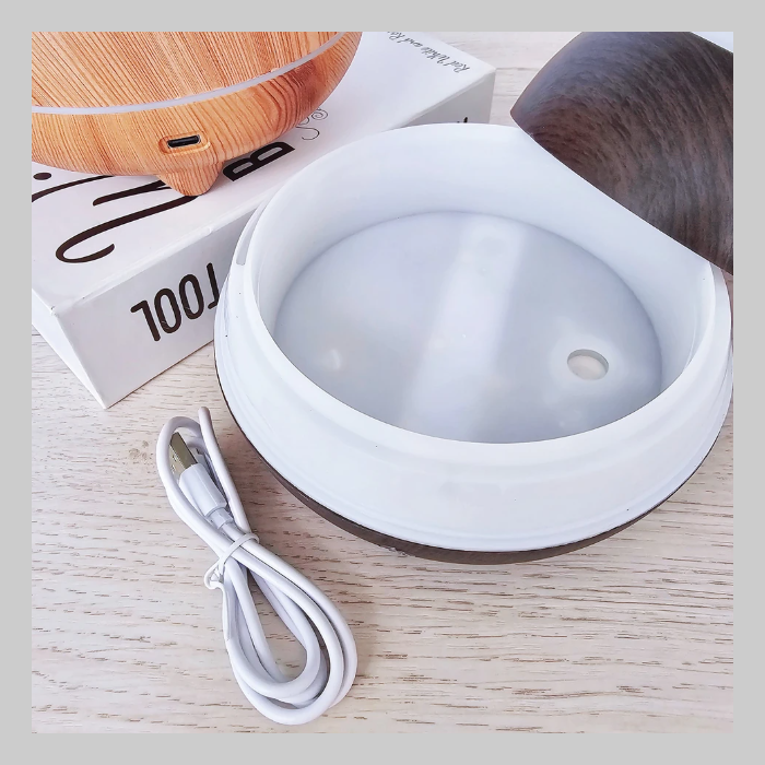 (Humidificador diseño símil madera en forma de montañas, cuenta con un botón para luz nocturna con varios tipo de luces, botón para humidificador y temporizador).