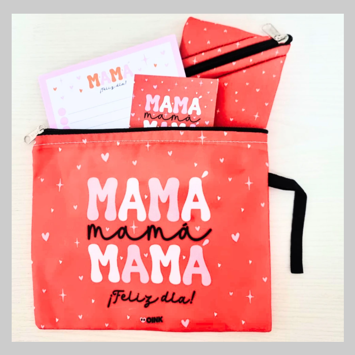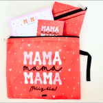 Incluye Bloc de notas con frase mama + tarjeta personalizada + Neceser vertical de neoprene + neceser de neoprene grande con cierre para llevar todo el kit y adicionales que mami necesite siempre con ella!